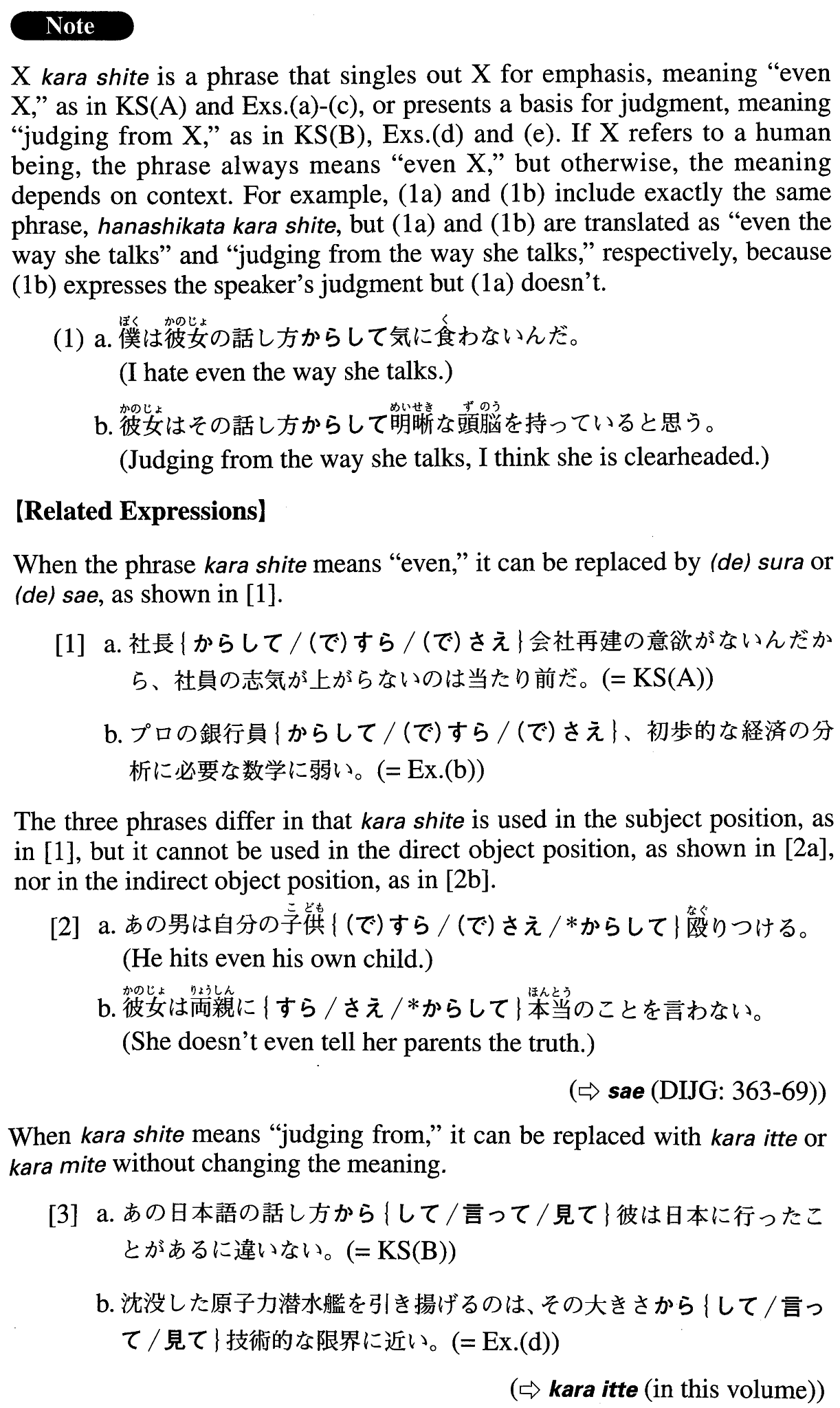 | 【Related Expression: (で)すら; (で)さえ; からいって; からみて; にしてからが】 | |