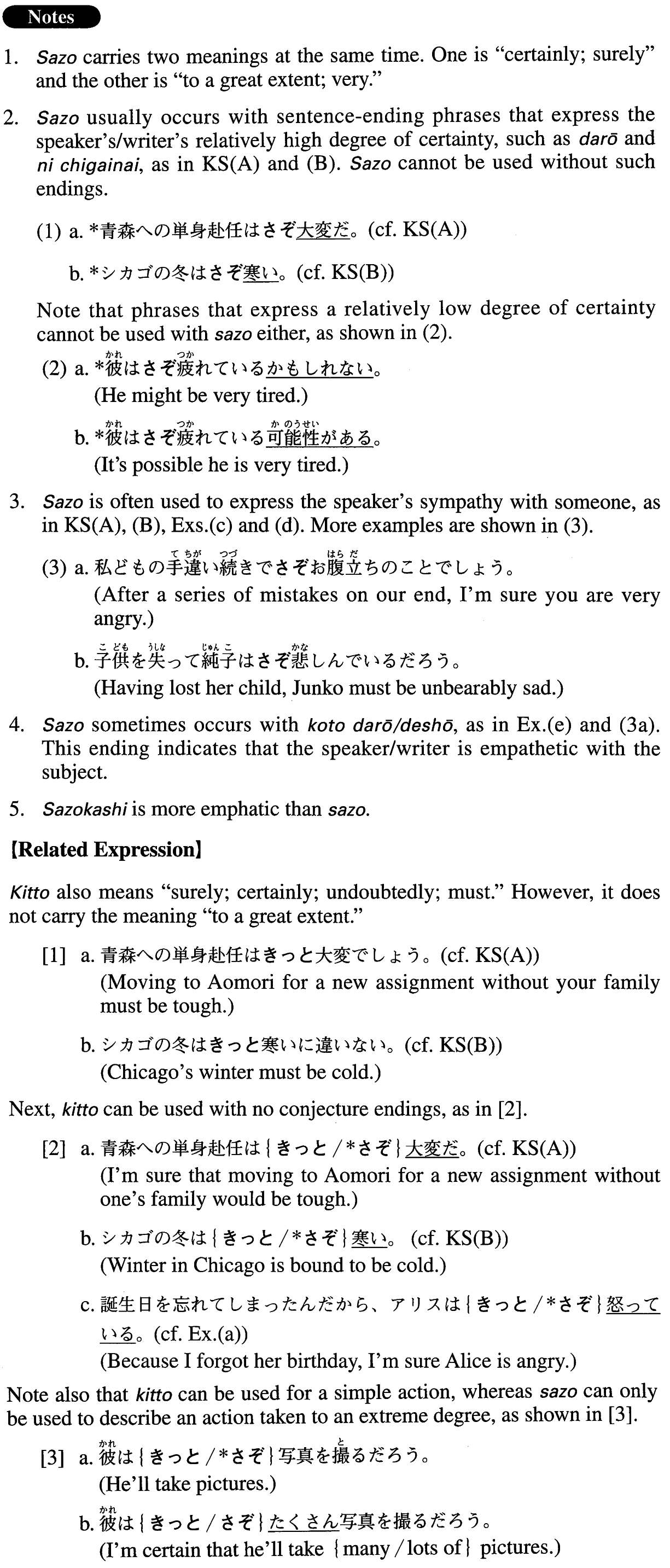 | (ii)さぞ(かし) | Adjectiveなstem {∅/だった}{だろう/に違いない}/etc. | |