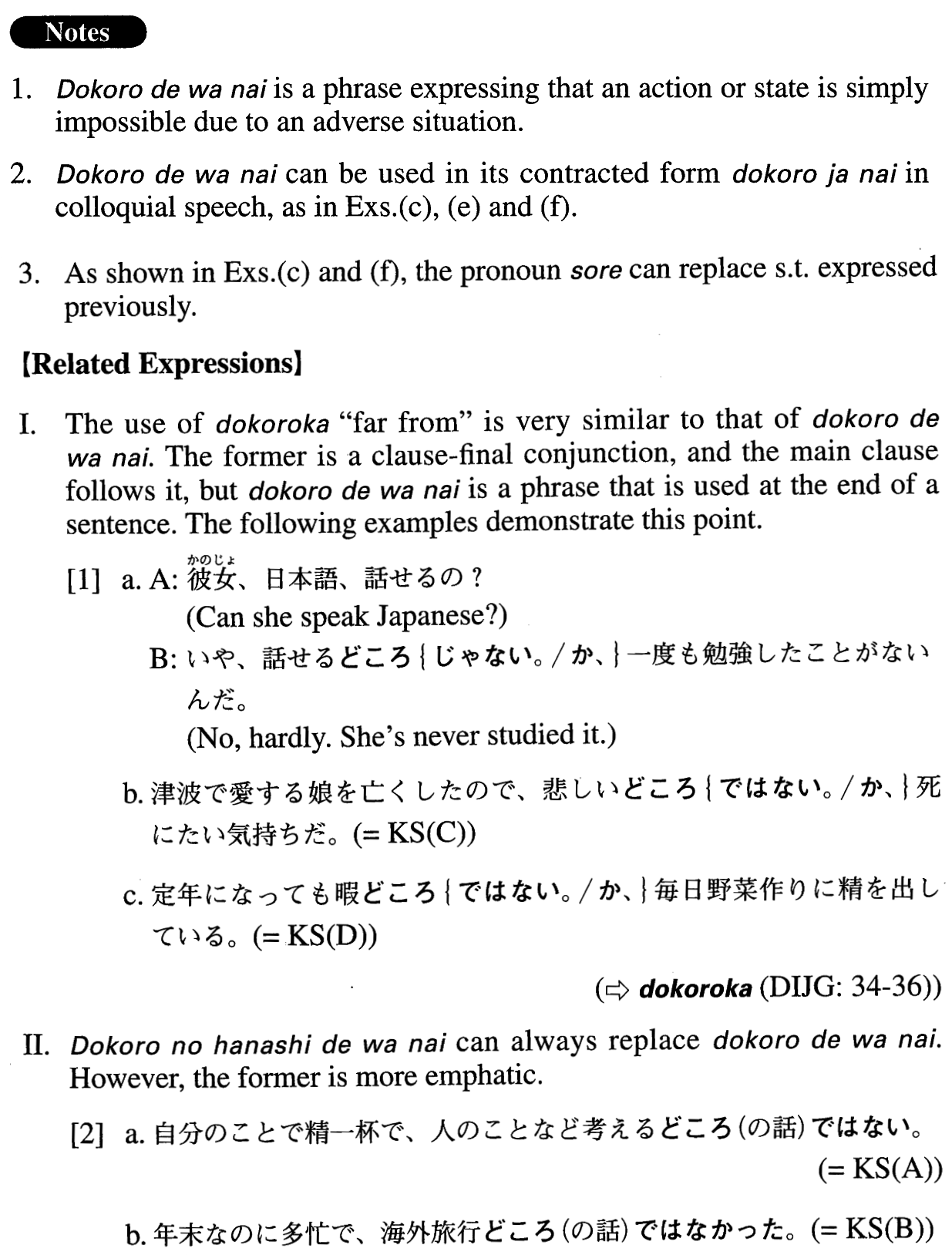 | (ii)Noun (をする) | どころではない | Where Noun is typically an action noun |