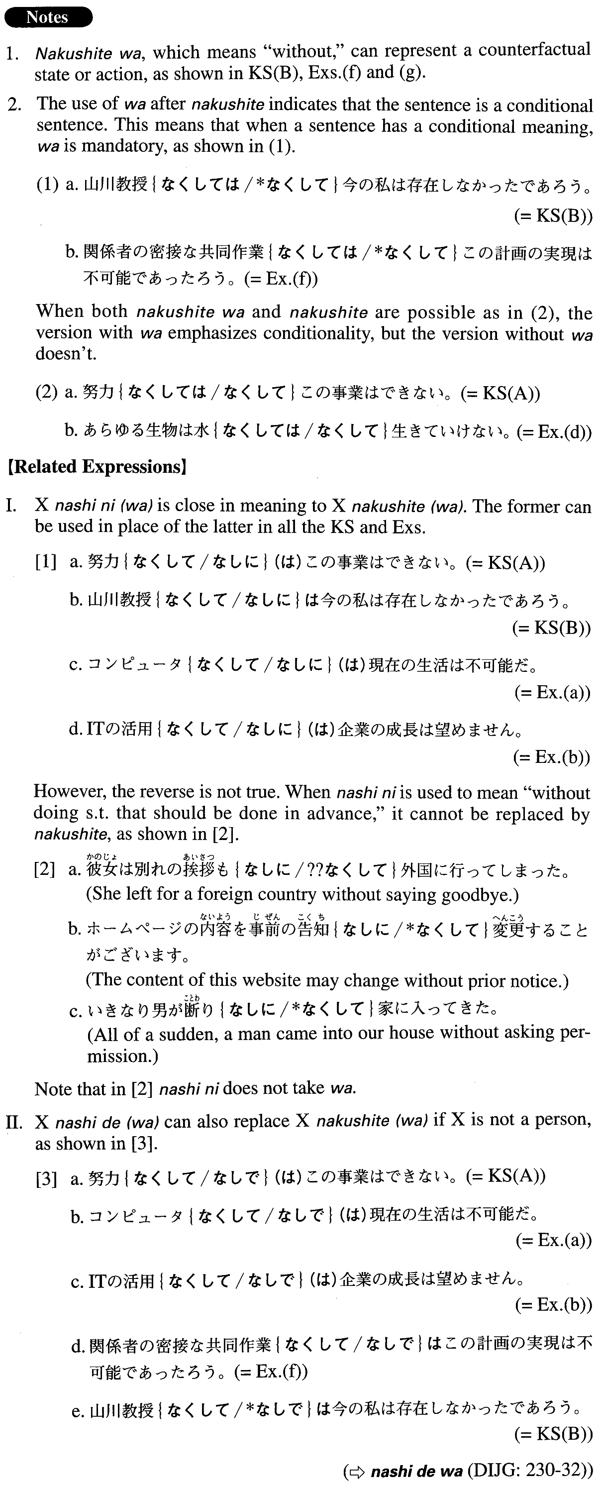 | 【Related Expression: なしに(は); なしで(は)】 | |