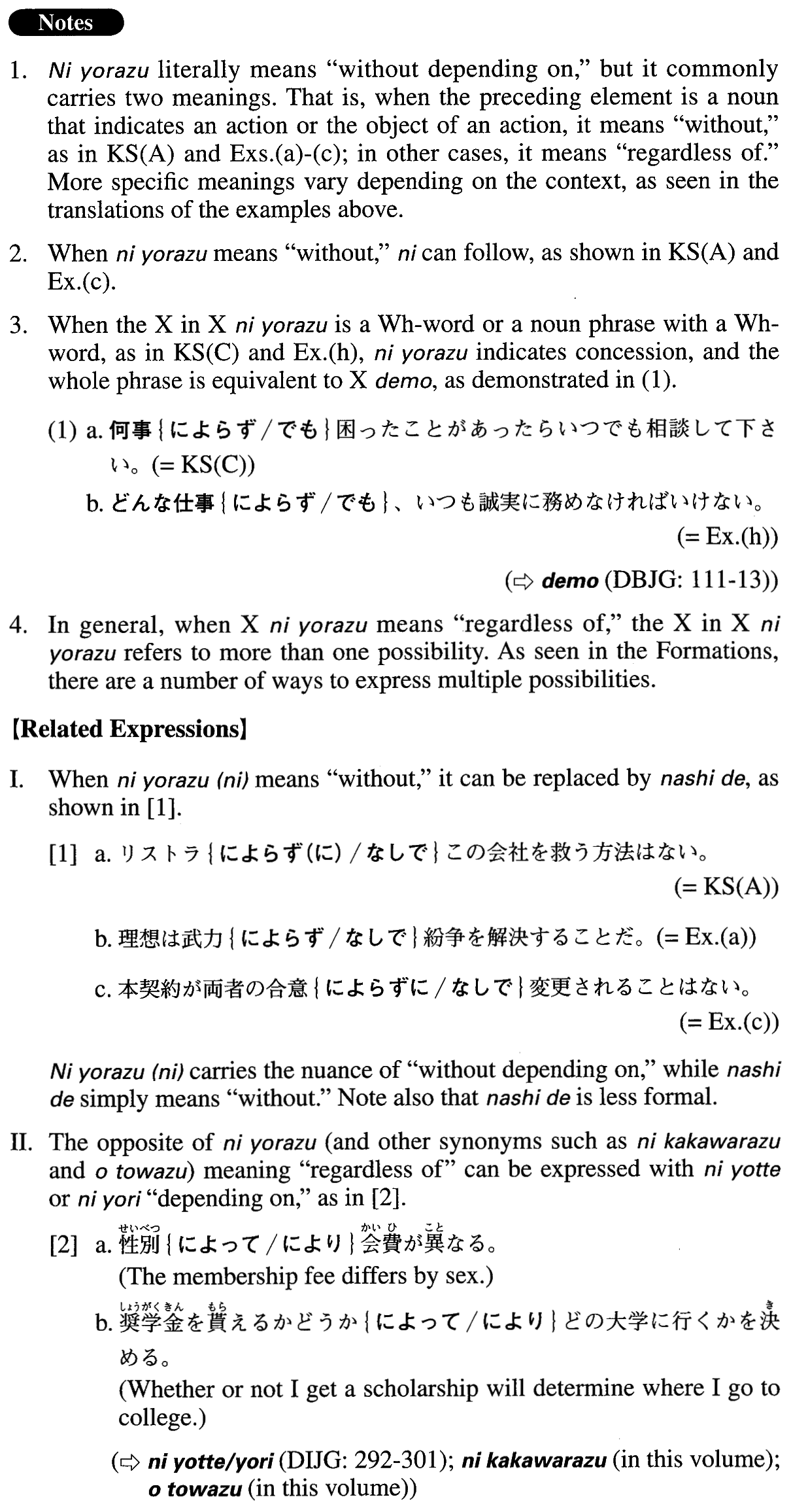 | 【Related Expression: なしで; によって/より; を問わず】 | |