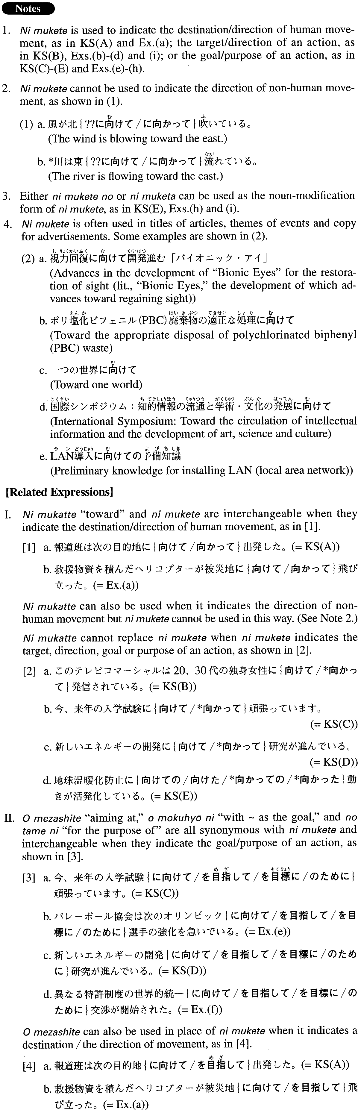 | A compound particle that indicates the destination/direction of movement, the target/direction of an action, or goal/purpose of an action. | Toward; to; at; aiming at; for the purpose of; in order to |