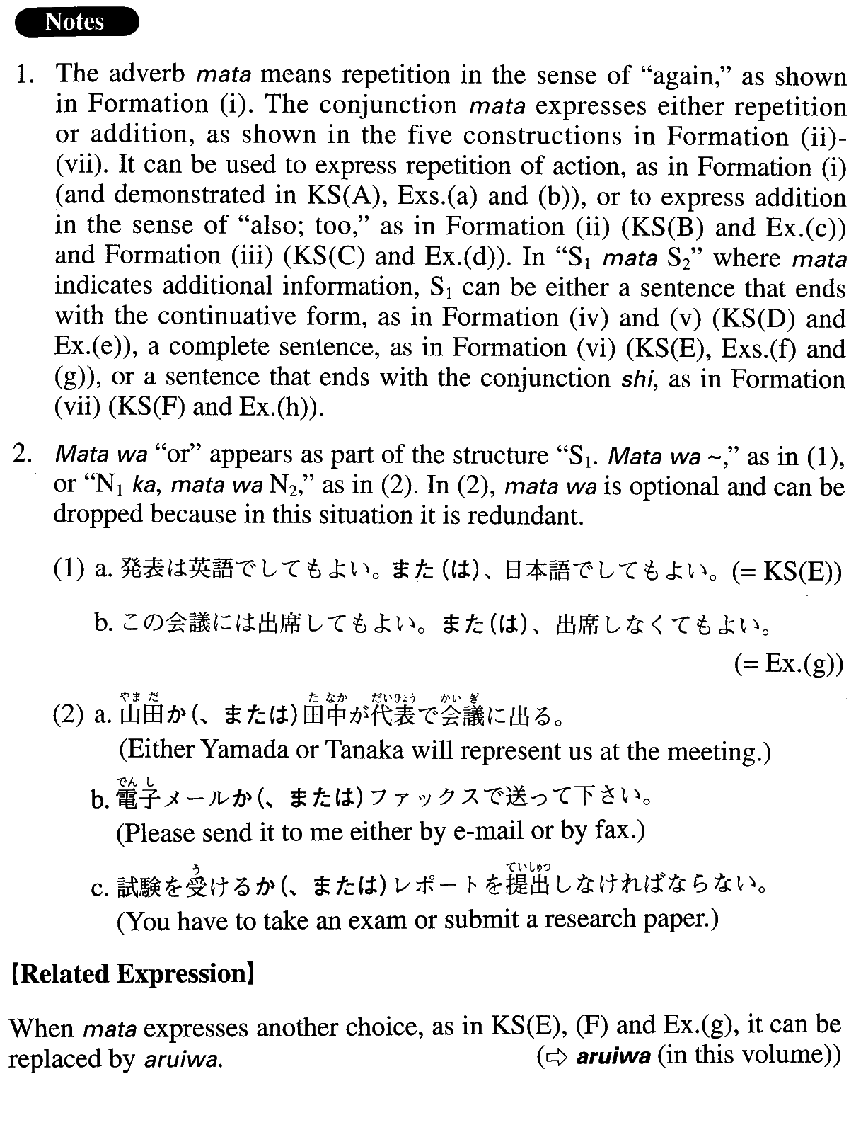 | (iv)~{Vます/Adjectiveいstemく}、 | また、Sentence。 | [additional information] |