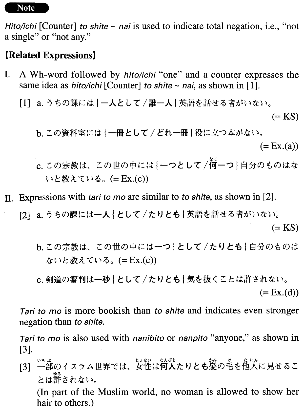 | 【Related Expression: {Interrogative word] ひと/いち [counter]~ない; ひと/いち [counter] たりとも~ない】 | |