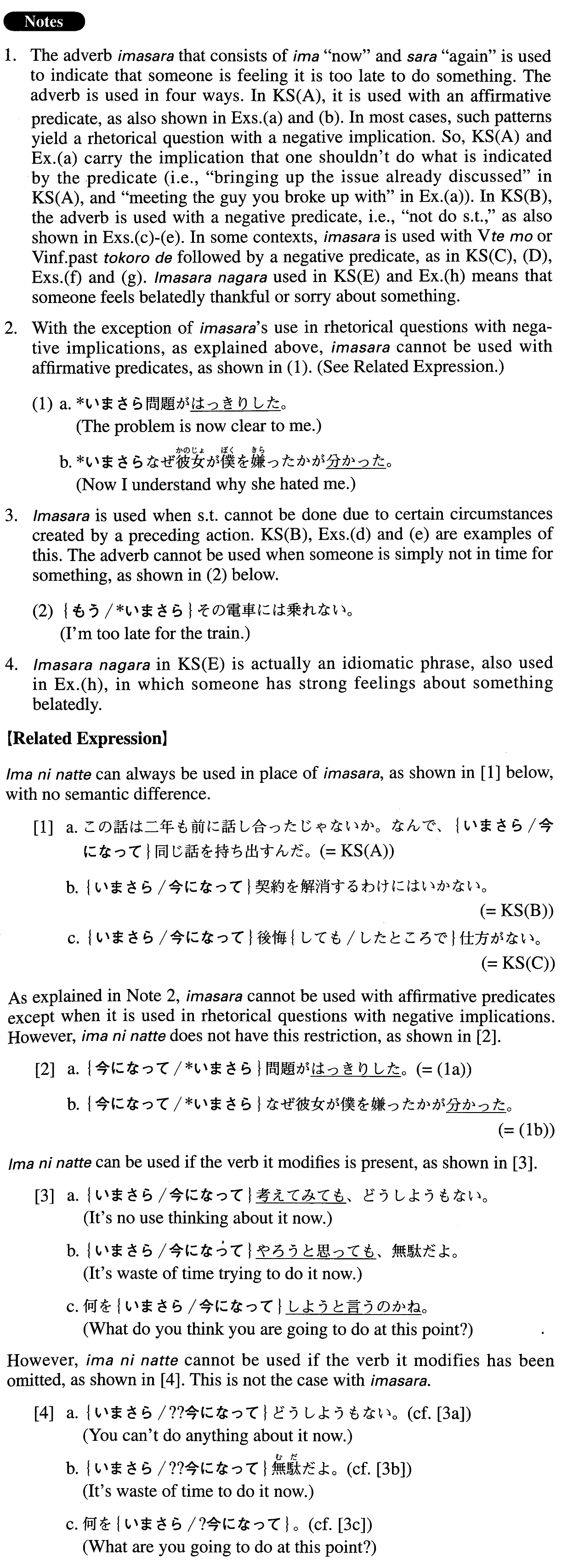 | (i){今更+Wh-word/Wh-word+今更} | +Predicate (Affirmative)(か)。 | |