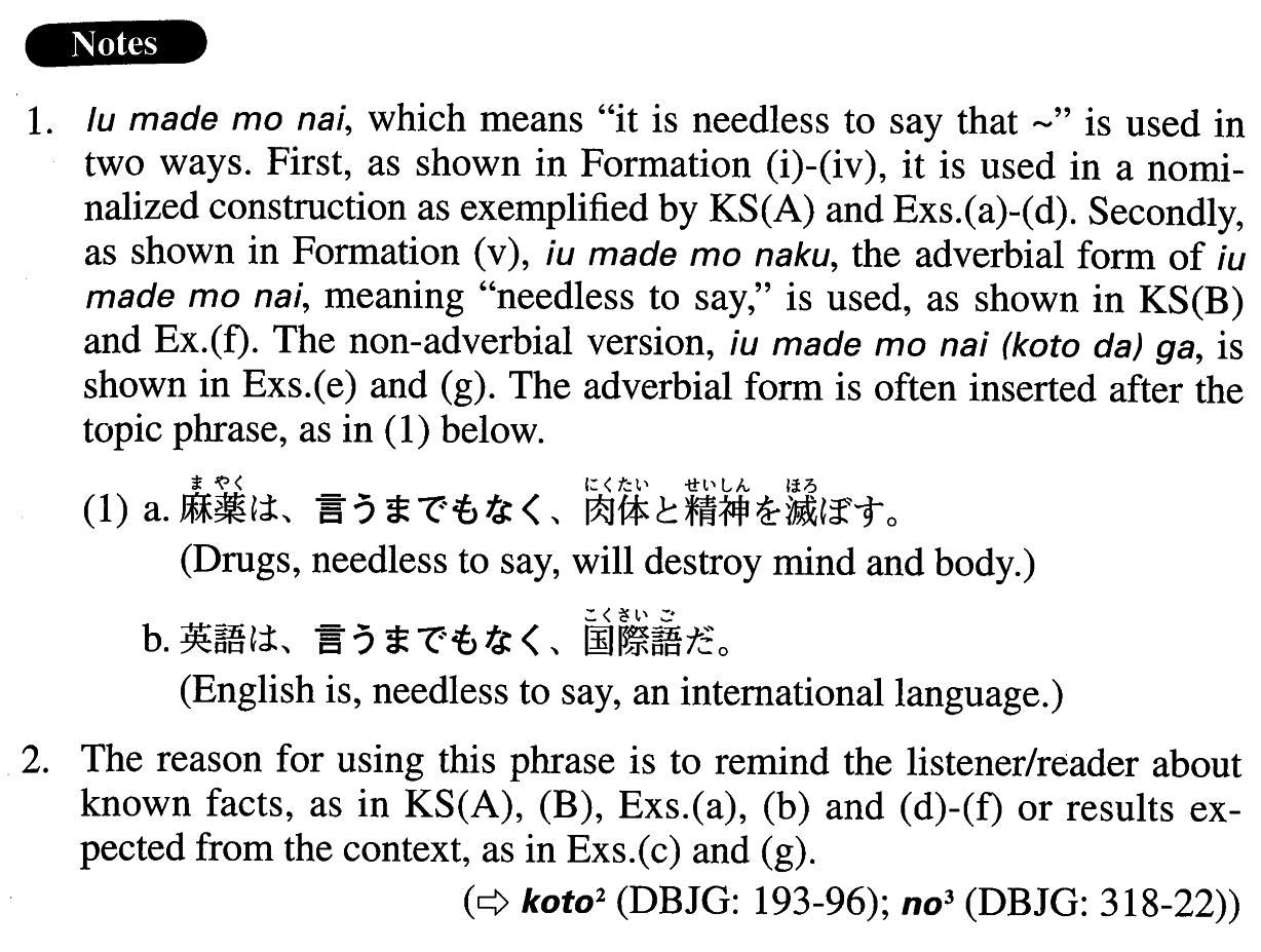 言うまで{なく/ない(ことだ)が}、日本は島国だ。 Needless to say, Japan is an island country