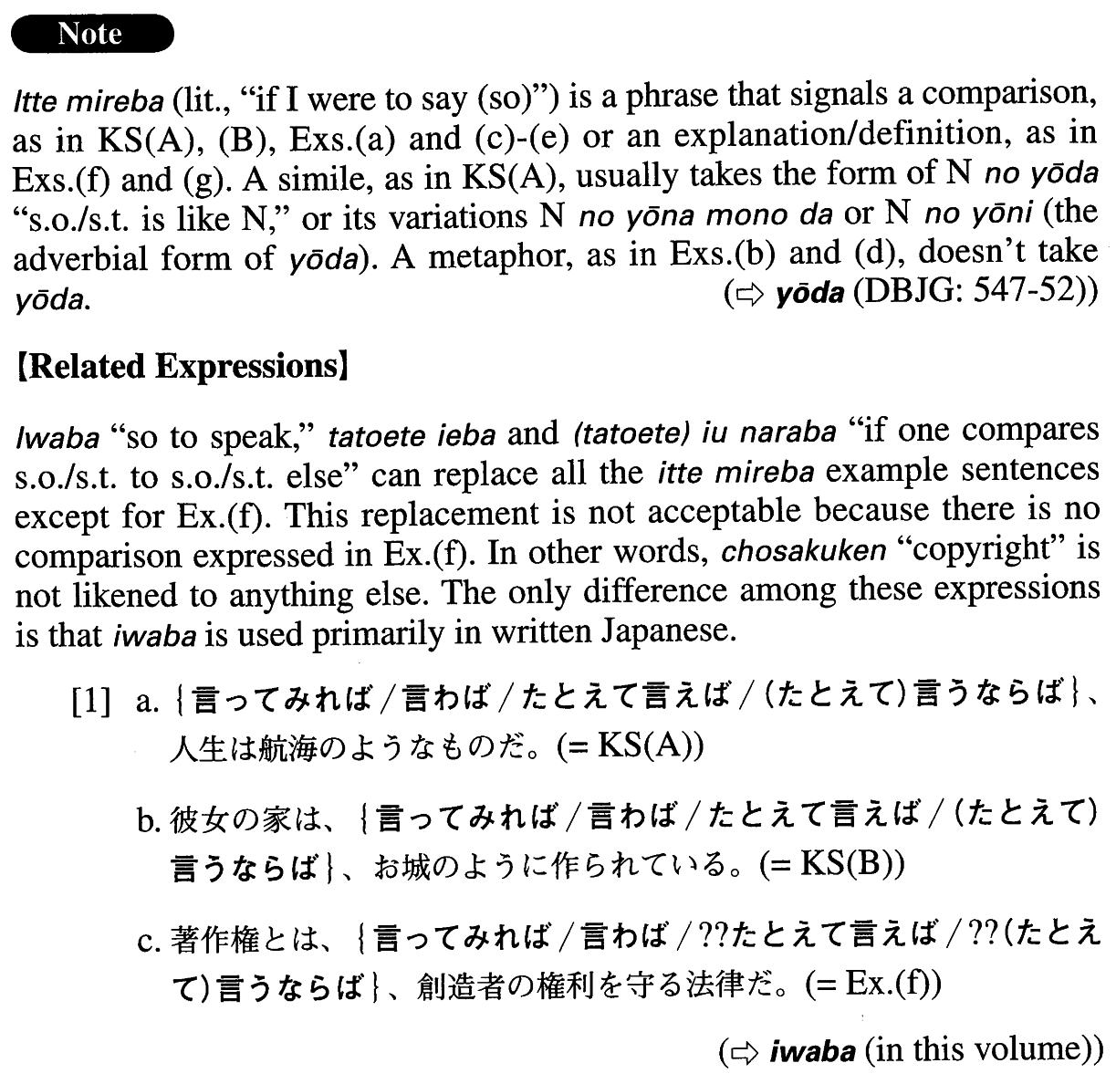 | 【Related Expression: 言わば; 例えて言えば; (例えて)言うならば】 | |