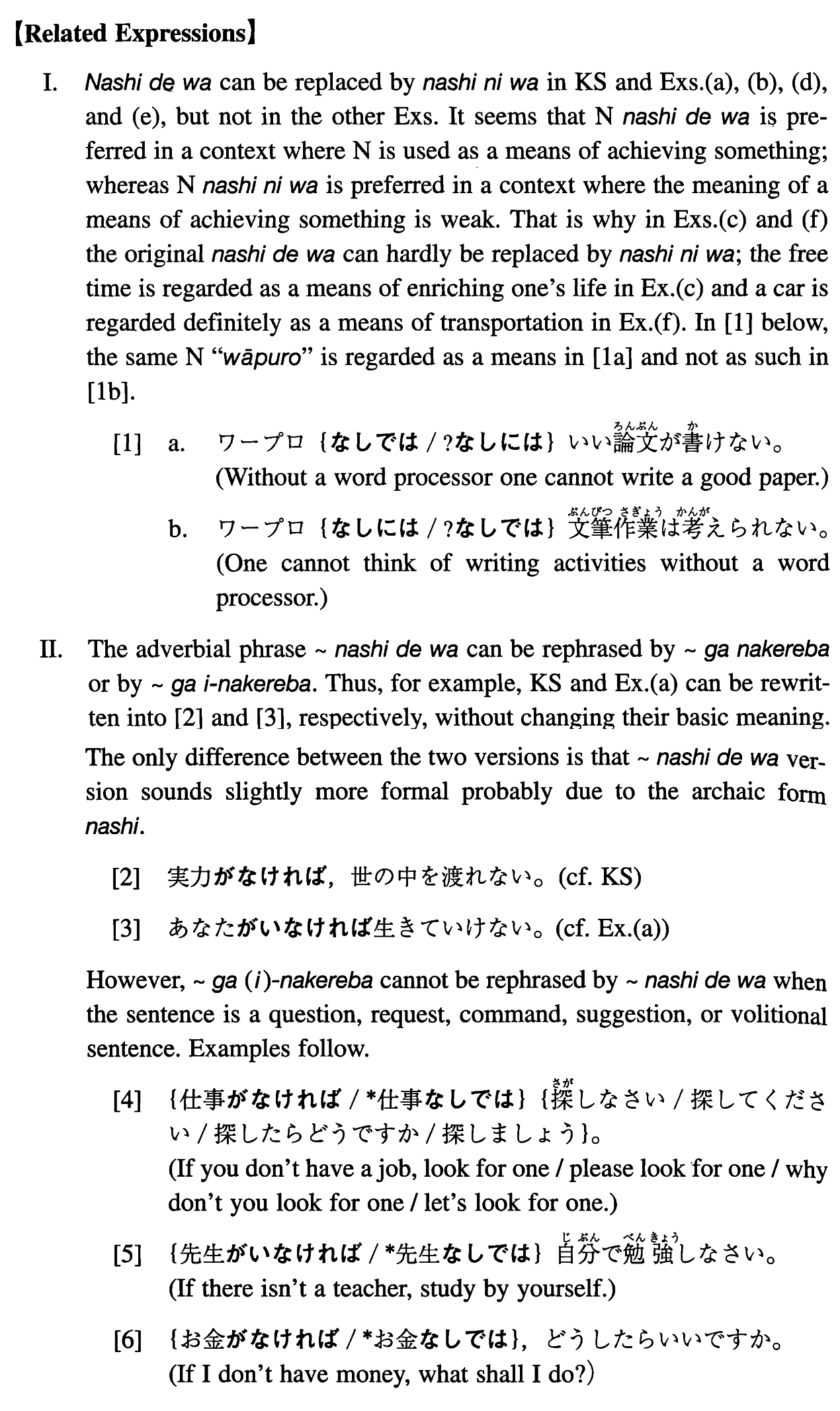 | 【Related Expression: が(い)なければ; なしには】 | |