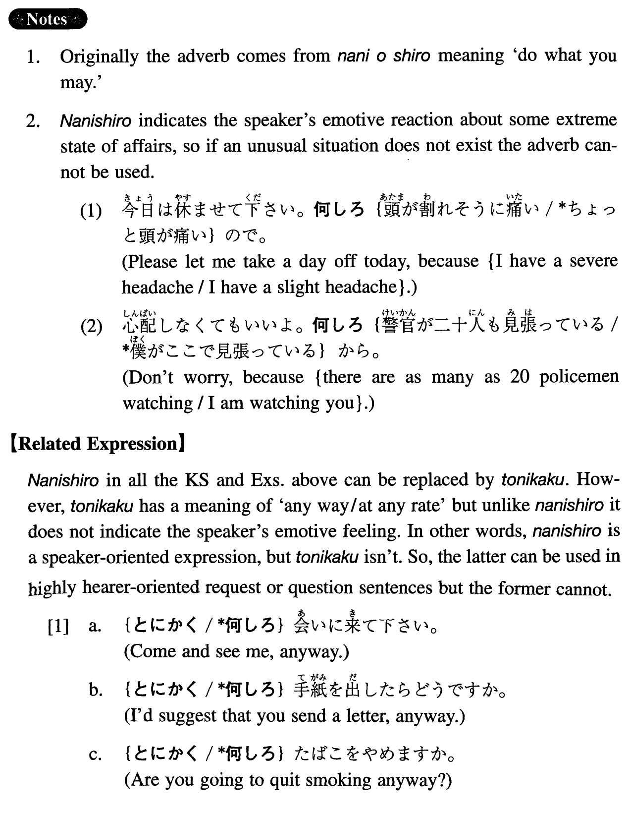 | An adverb that indicates the speaker's emotive feeling about some extreme state of affairs. | As a matter of fact; no matter what; believe it or not; you may be surprised, but~; in fact; unbelievably |