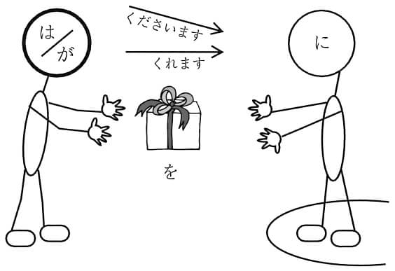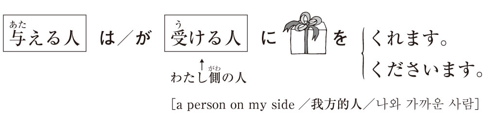 1)ものを与える人を主語にした授受の言い方。ものを与える人は「わたし」、または受ける人より心理的に「わたし」に近い関係の人である。