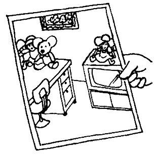 ❹ A:え、かぎがない? そんなはずないよ。ぼくたしかに机の上に置いたよ。