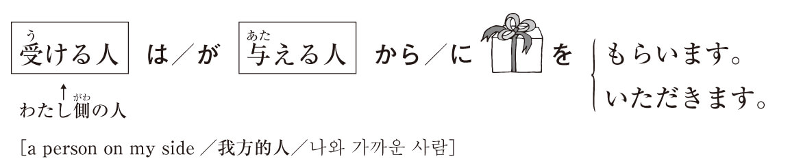 1)ものを受ける人を主語にした授受の言い方。ものを受ける人は「わたし」、または与える人より心理的に「わたし」に近い人である。