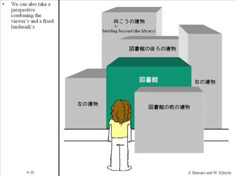 This unit explains that spatial relations in Japanese are expressed with noun phrases in the form of [reference point + の + relative position] as in 私の後ろ "behind me."
