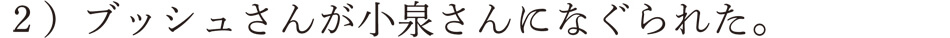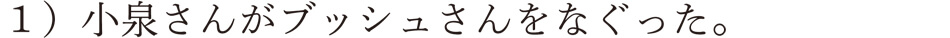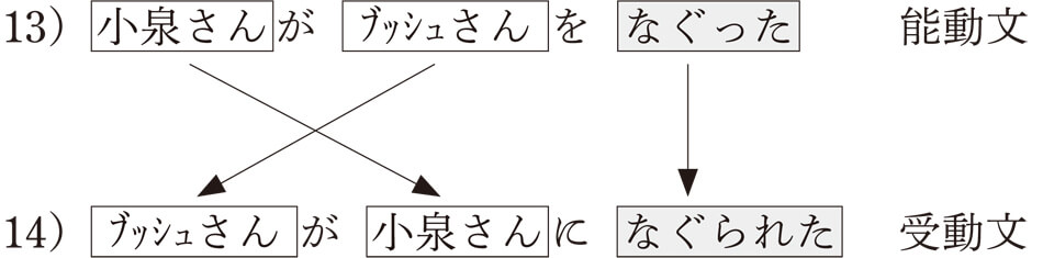 パーツとしては、「小泉さん」と「ブッシュさん」と「なぐった」でしたね。これを入れ替え、助詞と動詞を修正することで、受身文はできあがりました。具体的には、「ブッシュさん」はヲ格からガ格へ、「小泉さん」はガ格からニ格へ、「なぐった」は「なぐられた」という受身形に変わったわけです。したがって、ブッシュさんは小泉さんから直接影響を受けているという意味で、直接受身文と呼ばれるわけなんです。
