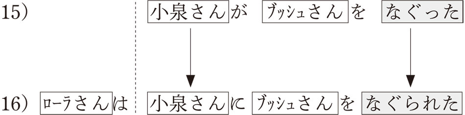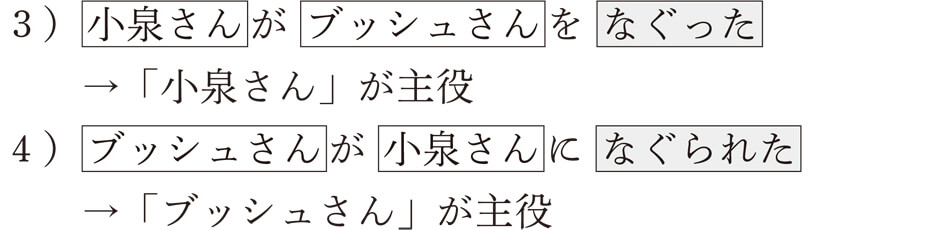 4)では、「ブッシュさん」はヲ格からガ格に、「小泉さん」はガ格からニ格に、「なぐった」という動詞は「なぐられた」に変わっています。このような変化の対応をボイスと言います。3)のような文を能動文、4)のような文を受動文(受身文)と呼ぶんですね。第3章で見た自動詞と他動詞の対応もボイスの一つと考えることができます。たとえば、