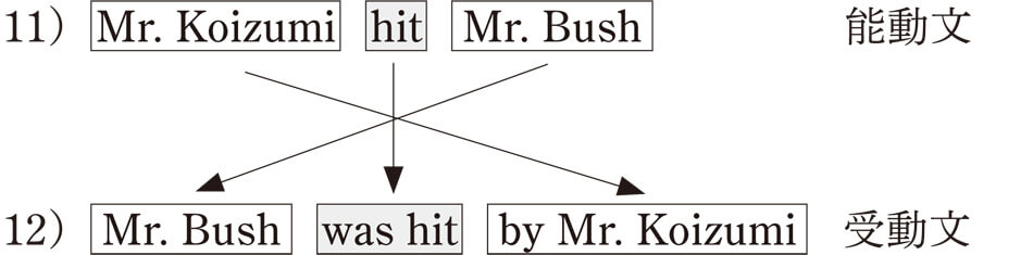 英語では、一番はじめに来るのが主語となりますので、“Mr. Bush”を前に出すと、動作主であった“Mr.Koizumi”は動詞の後に来て、by という前置詞がつきます。動詞も、“hit”から“was hit”に変化します。このことから、能動文は必ず他動詞文であり、その目的語を主語にすることで受動文が成立することになります。