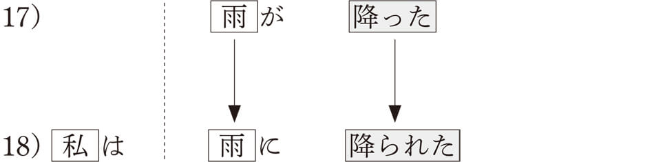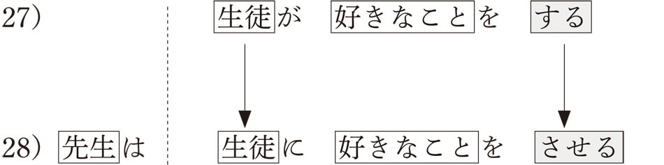 受身文と使役文との違いは、助詞の交替とともに動詞が変化するのではなく、動詞自体がまるごと替わってしまうということなんですね。対応する動詞を使って、主役を交代させることから、ボイスの表現に分類されるわけです。