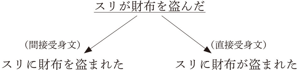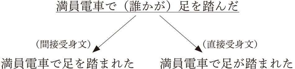 じつは、この間接受身文の発想は直接受身文とはまったく異なるんです。直接受身文は文字通り、主役を誰にするかという選択によって、できたものでした。ところが、この間接受身文はそのような主役が入れ替わるという発想ではないんですね。では、どんな発想かと言うと、その出来事全体によって影響を受ける人を主役にするという発想です。