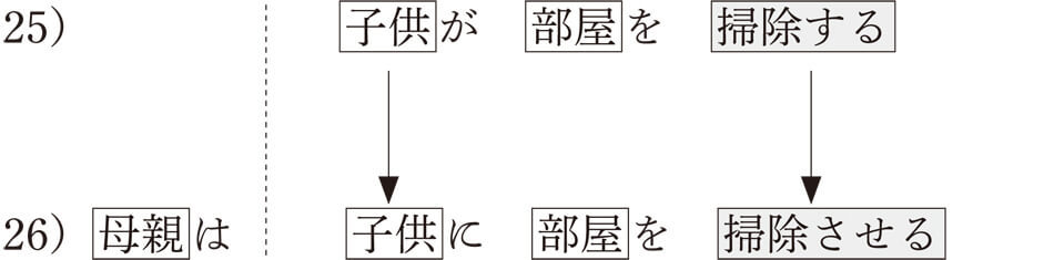 という具合です。5)も6)も話者は同じ事実を見ているんですが、「変化」を中心に表すと「おもちゃ」が主役になるし、「動作」を中心に描くと、「子供」が主役になるんですね。ボイスではもう一つ重要な形式があります。それは、使役形です。