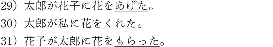 日本語のボイスの表現では、受身形と使役形が代表的な形式でしたが、もう一つ重要な形式があります。それが、「やりもらい動詞」です。文字通りやったりもらったりすることを表す動詞なのですが、具体的には「あげる」「くれる」「もらう」という3つの動詞の表現になります。「やる」は「あげる」と同じ意味ですので、ここでは「あげる」のなかに含めて扱うことにします。この「やりもらい動詞」にもまた、日本人の心が反映されています。まずは、3つの動詞による基本的な表現を見てみましょう。
