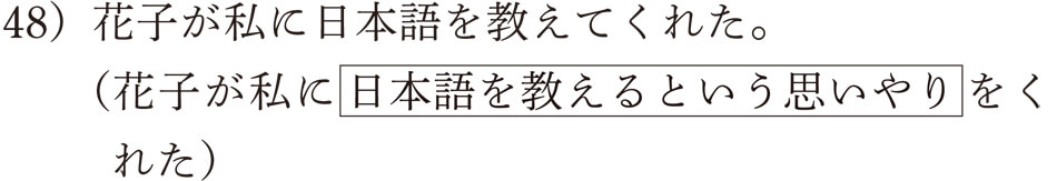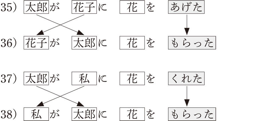 本書では「思いやり」という言葉を使っていますが、文法書によっては、「恩恵のやりもらい」や「好意のやりもらい」などと言うこともあります。でも、「思いやり」と言うほうが日本人の心を表していて、私にはぴったりだと思えるんですが、いかがでしょうか。