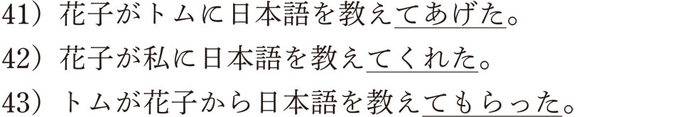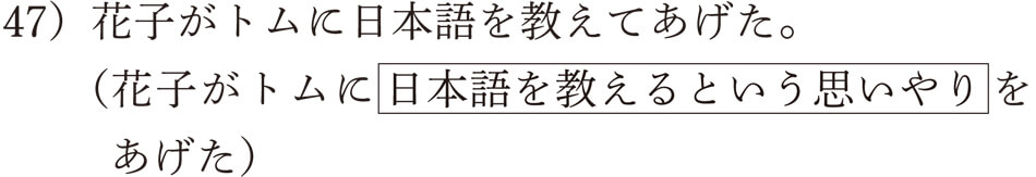 まず、例文41)から考えましょう。この文の事実は、「花子がトムに日本語を教えた」ということですね。それで、どうして、「~てあげる」が使われているかということですが、日本語ではこの事実を、「花子が『日本語を教える』という思いやりをトムにあげた」と考えるわけです。これをわかりやすく示すとこんな感じです。