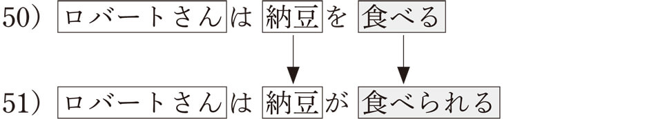 例文50)では、ロバートさんが主題であり主語でもありますね。主語と主題については、すでにお話ししましたが、もう一度説明しますね。この文は「ロバートさんが納豆を食べる」というコト(事実の部分)から、「ロバートさんが」という主語が主題化されたものです。したがって、「ロバートさんは」は主語でもあり、主題でもあると言えるわけです。「ロバートさんについて言えば、納豆を食べる」という意味ですね。それに対し、例文51)では、「ロバートさんに納豆が食べられる」というコトから、「ロバートさんに」が主題化されていると考えることができます。ということは、主語は「納豆」ですね。つまり、可能形の主語は、実現が問われる事柄になっているんです。英語では一般的に“can”を使って日本語の可能構文を、“Mr. Robert can eat Natto”などと訳しますが、アルフォンソさんという有名な日本語研究家は、このような日本的な表現をそのまま、英語に翻訳し、そのニュアンスを学習者に伝えようとしました。