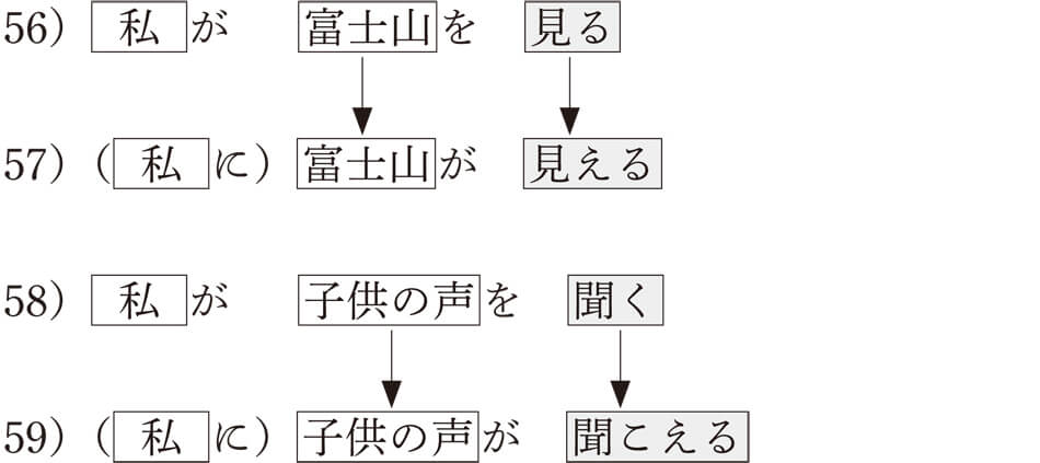 次に、自発形もまた、このような日本人の物事に対するとらえ方を表しています。自発形は出来事が自然に発生することを表す形式ですが、その数自体はそれほど多くはありませんが、日常的によく使われる自発動詞に、「見える」と「聞こえる」があります。