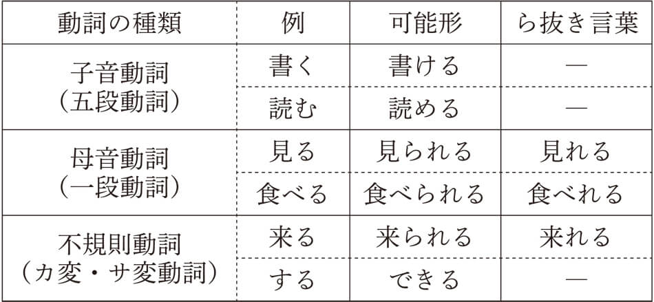 ただ、可能形のなかにはもともと「ら」が入らない形式もあるため、すべての可能形が「ら抜き言葉」になるわけではありません。じゃあ、「ら」が入っている動詞と入っていない動詞では、何が違うんだろうということになりますが、子音動詞の可能形には「ら」が入りませんが、母音動詞の可能形には「ら」が入るんです。