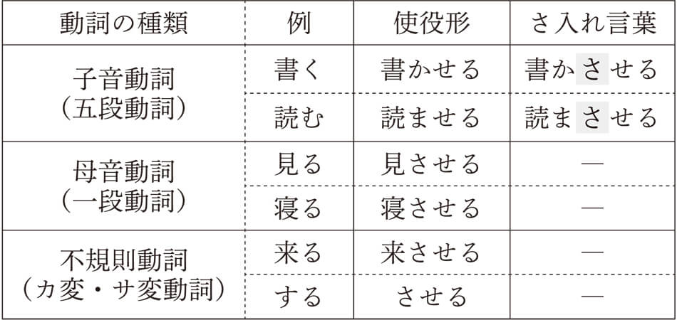皆さん、「さ入れ言葉」を、聞いたことがありますか。「ら抜き言葉」ほどは有名ではありませんが、私たち、日本語教育関係者のなかではよく話題になる現象です。「ら抜き言葉」は「ら」を抜く表現でしたが、「さ入れ言葉」は反対に「さ」を入れて使うものですね。どの表現に「さ」を入れるかというと、使役形です。それも子音動詞の使役形だけにです。「ら抜き言葉」は母音動詞と「来る」の可能形から「ら」が抜けましたが、使役形では、子音動詞だけに「さ」が入ります。なぜ母音動詞に「さ」が入らないかというと、すでに「さ」が入っているからなんですね。次の表を見てください。
