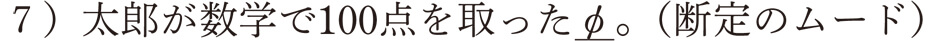 「太郎が数学で100点を取った」というコトを、そのまま聞き手に提示すれば、話者がその内容を確定して聞き手に伝えるということになり、「断定のムード」となります。形式的には何もありませんが、ムードの重要な表現です。もし、文中で使われると(文の最後で言い切られない場合)、断定のムードではなくなるので注意してください。