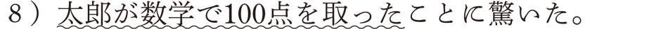 この場合、「太郎が数学で100点を取った」は「~こと」につながり、「驚く」という述語の必須成分「太郎が数学で100点を取ったこと」を形成することになります。したがって文の最後に断定のムードとして発話されたものではないんですね。なお、このような「~こと」の構造については、第8章で詳しく説明します。