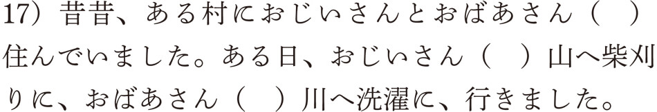 日本人であれば、最初の括弧には「が」を、その後の2つには「は」を入れたはずです。なぜ入れたのでしょうか。それは、まさに新情報と旧情報の違いによって入れ分けたからなんですね。昔話の語りはじめの部分では、聞いている人にとって「おじいさんとおばあさん」は新しい情報になります。したがって、「が」を入れたわけです。しかし、いったん紹介されると、今度は古い情報になるわけですから、その後は「は」を入れたということになるんです。皆さんは、これを無意識にやっていたわけです。