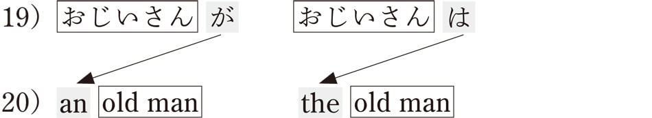 これは、じつは英語の不定冠詞(a/an)と定冠詞(the)の使い方とまったく重なっているんですね。17)の例文を英語にするとこんな具合です。