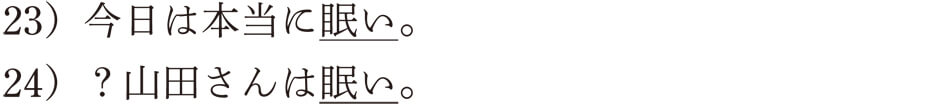 24)の例も22)の例と同じように、「眠たがっています」「眠いようです」「眠いみたいです」のような表現にしなければならないんですね。英語ではこのような制約はなく、日本語ではおかしい22)と24)の例も、