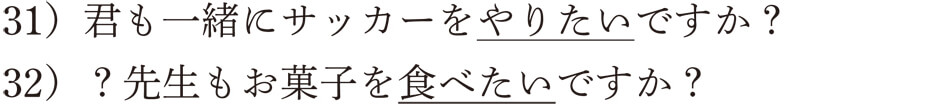 サッカーを見学している少年に31)の文を使うことはできますが、先生に対して32)の文は少し失礼ですね。英語では目上の人であっても、“Do you want to have some cookies?”などと言えますので、留学生は普通に日本語の先生に聞いたりしますが、日本語教師は慣れたもので特に嫌悪感を持ったりしません。でも、一般の日本人だと、押しつけがましい感じがして、嫌な印象を持つでしょうね。