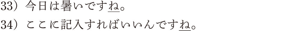 において、最初の例は、同意を求める「~ね」ですね。「暑い」という感覚を相手と共有したいという気持ちの表れでしょう。34)の例は、自分より記入のしかたをよく知っている相手に書き方を確認している例ですね。ちなみに、同意を求める文では、「そうですね」などと、「~ね」を使って返事をすることができますが、確認の文では、「そうです」と「~ね」を使わないで返事をするのが普通です。