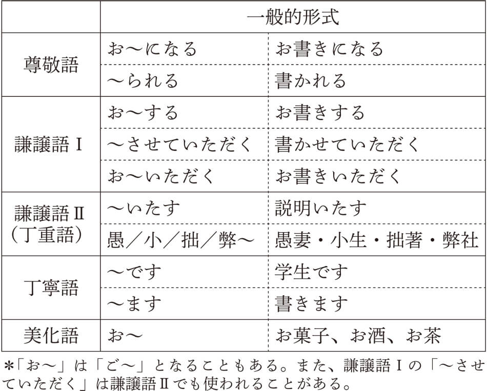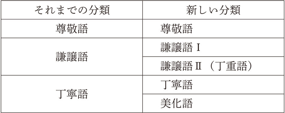 ところで、丁寧語や尊敬語、謙譲語などをまとめて敬語と呼びますが、2007年にこの敬語表現について、大きな変化がありました。それは文化審議会国語分科会の答申により、新しい「敬語の指針」が発表されたからです。敬語はそれまで「尊敬語」「謙譲語」「丁寧語」という3つの区分で説明されてきましたが、指針では、この分類を細分化し、5つの分類を提示したんです。どのように分類したかと言うと、尊敬語はそのままで、謙譲語を謙譲語Ⅰと謙譲語Ⅱ(丁重語)に分け、丁寧語に美化語という分類を付け加えたんですね。せっかくですから、簡単にこの5つの分類を説明しましょう。