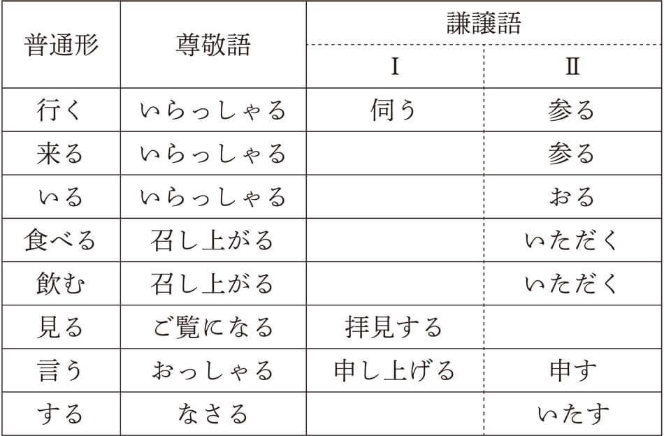 これらの一般的形式に加え、日常的によく使われる語には、それらの語だけに限定される敬語形式があります。次に、そのような特定形式の表現をまとめましたが、面白い特徴がありますね。